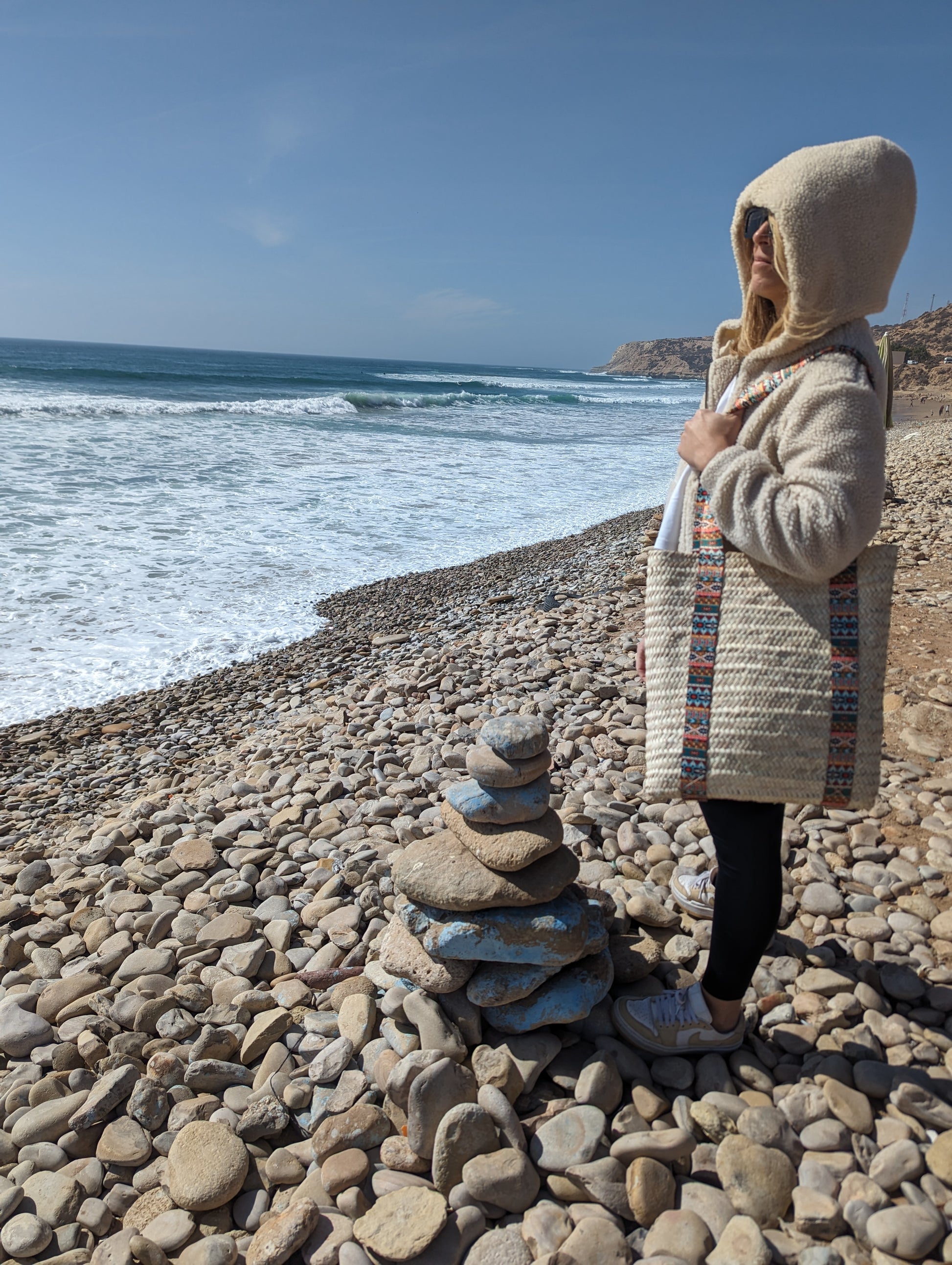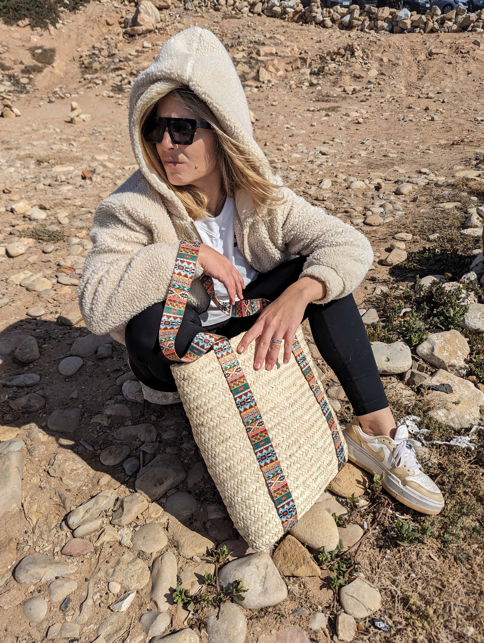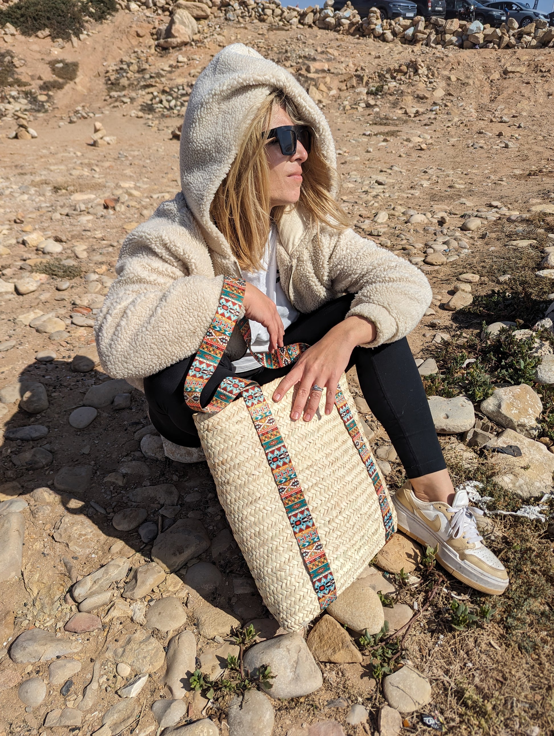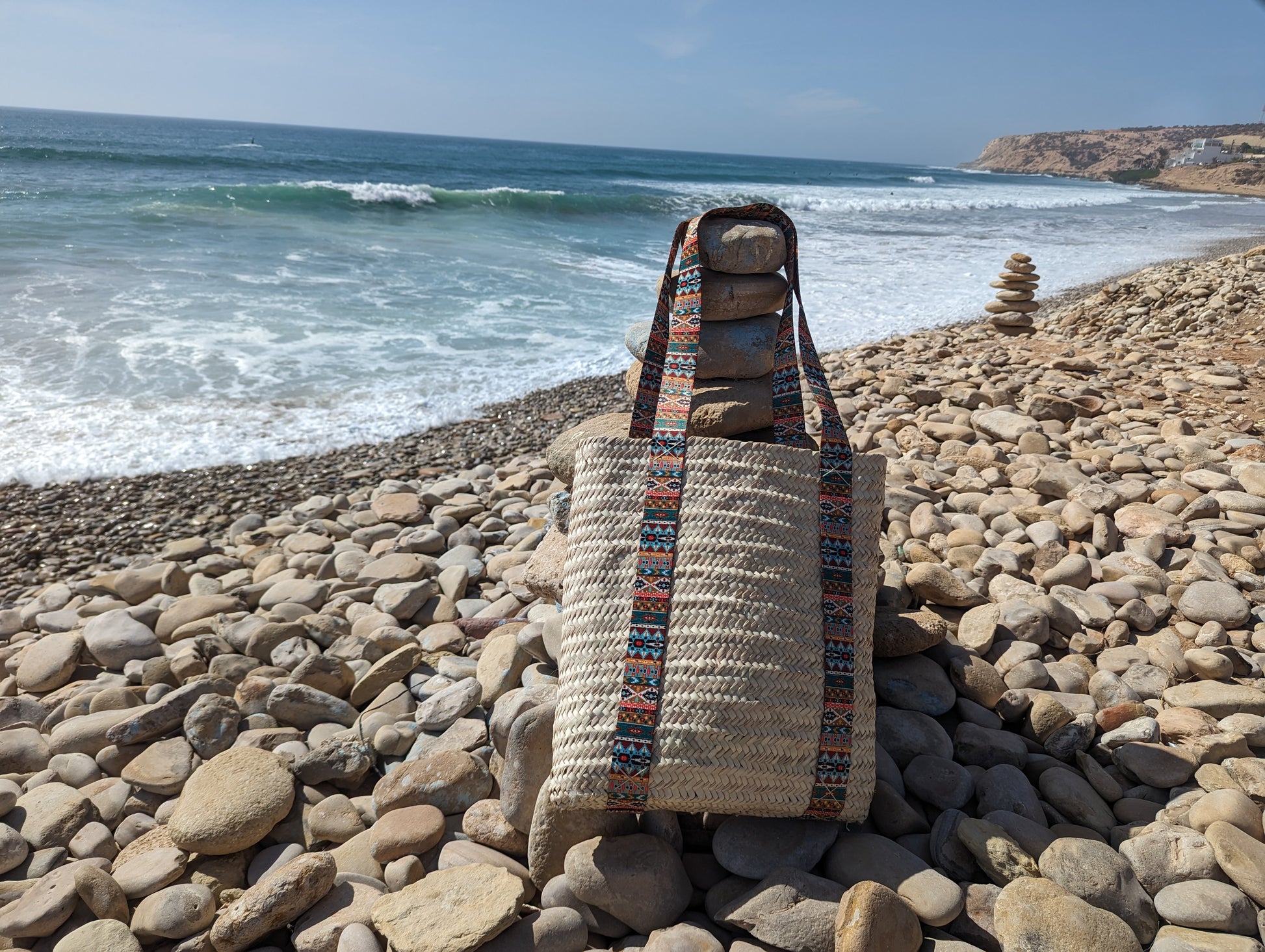 Ligero pero duradero, este bolso de paja encarna la esencia de la artesanía marroquí, lo que lo convierte en un accesorio imprescindible para quienes aman un toque de encanto bohemio. Ya sea que lleve hallazgos frescos del mercado o sus elementos esenciales diarios, esta cesta de compras es la combinación perfecta de tradición y estilo moderno.