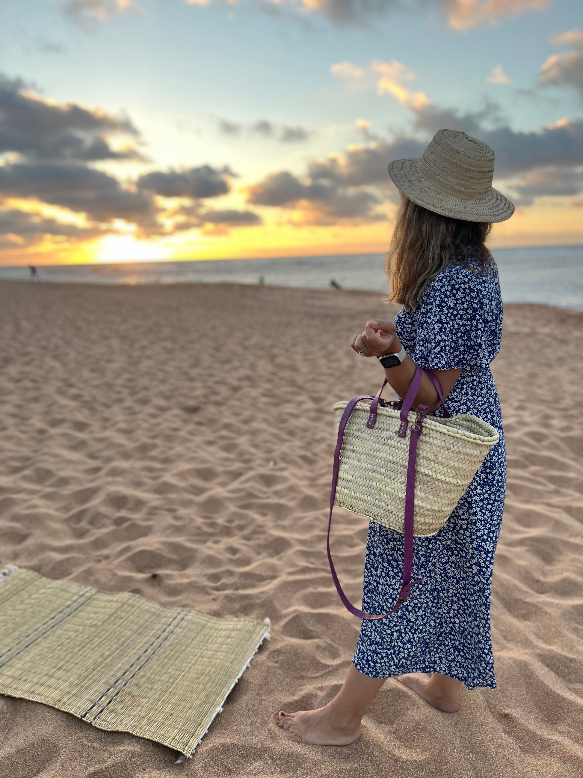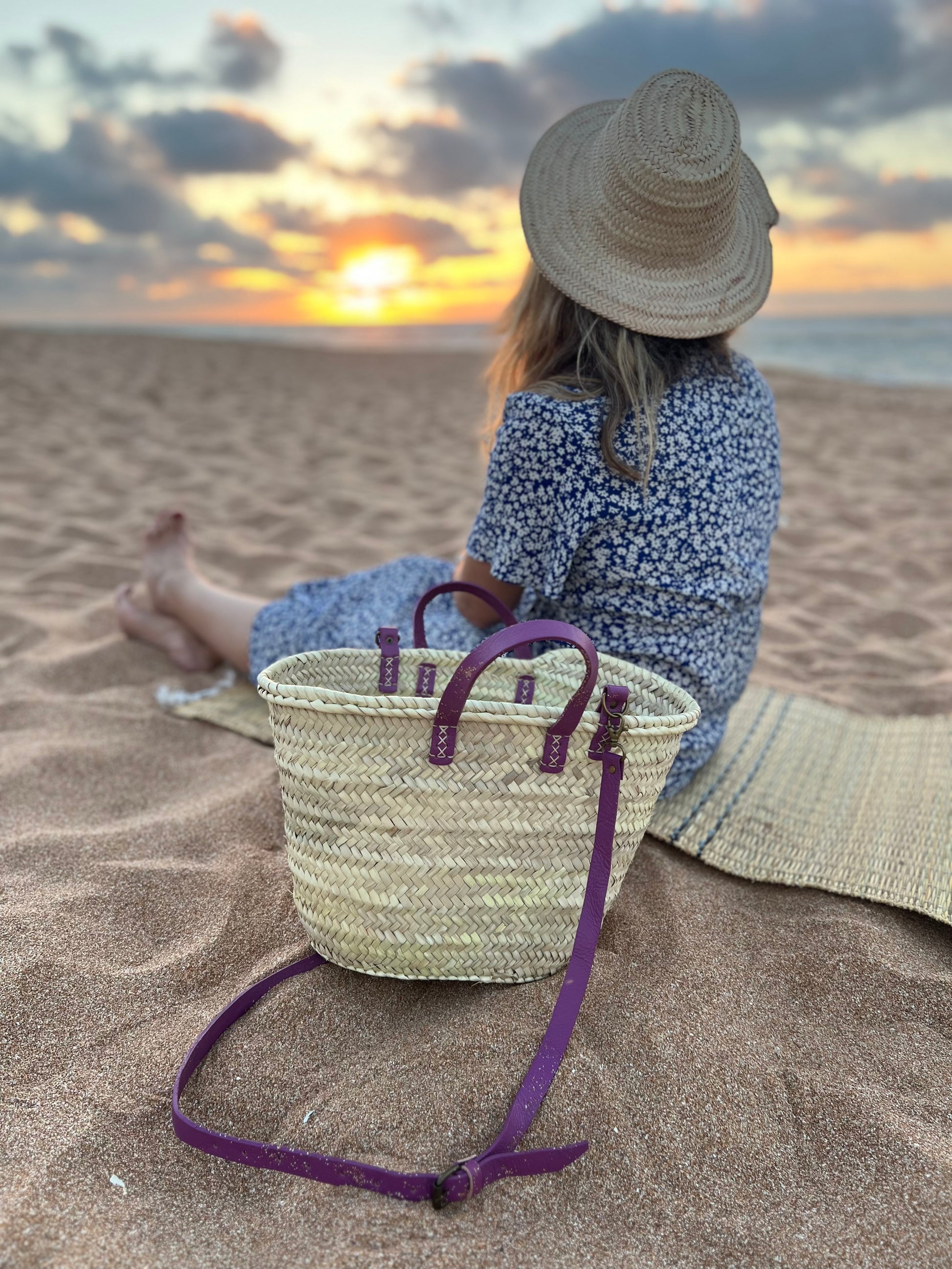 French Market Basket with Purple Leather Handle